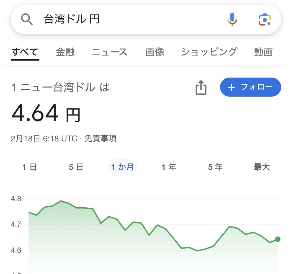2025年2月18日の1ニュー台湾ドルは4.64円