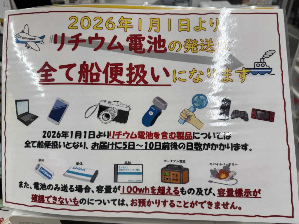 2026年1月1日よりリチウム電池を含む製品については全て船便扱いとなり、
